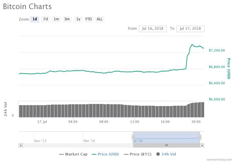 Bitcoin and the rest of the crypto market saw prices rally in under an hour, pushing Bitcoin to over $7,200 (at the time of writing).