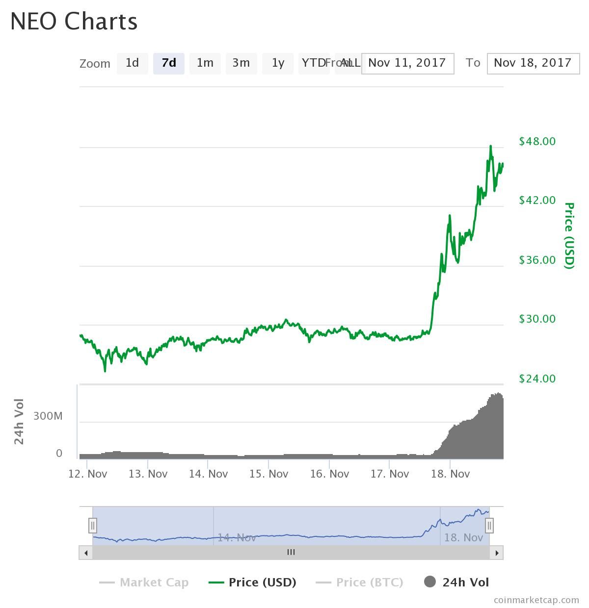 Yesterday (November 17) Neo’s price climbed significantly. Neo started the day priced at $28 and ended it at $41.